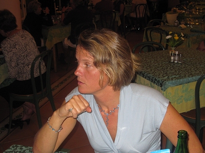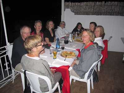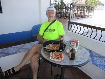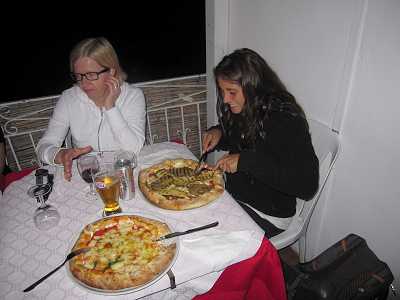 Nere vid hotellet igen tog vi en paus för att duscha och byta kläder. Sedan gick vi längre ner i byn för att äta kvällsmat. För min del åt jag nog den godaste pizza jag någonsin ätit. Vi hade en trevlig avslutning på dagen innan vi gick hem igen. I morse hade vi fri tid till framemot kl.13. Jag passade på att ta en joggingrunda upp till den restaurang, som vi gick förbi igår kväll. Det var c:a 3 km. dit, så det blev ingen lång tur. Det var klart väder och runt 25 grader. Därefter var vi några som tog ett dopp i havet. Det var svart sand att gå på och sedan lite kullerstenar. Det var skönt att bada, särskilt efter jogging turen. Vi packade sedan våra ryggsäckar för veckans höjdpunkt nämligen vandring upp till toppen på Stromboli för att se vulkanutbrott. Vi samlades först vid en restaurang Ingrid, för att äta lunch. Det finns en hel del här som påminner om den film från 1949, som Ingrid Bergman deltog i och som hette Stromboli. Restaurangen vid kyrkan, där vi ofta åt eller fikade, hade Ingrid i sitt namn. Vi fick en ordentlig lunch på pasta och därefter fisk. Nu sitter vi här i restaurangen och inväntar tiden för bestigning av Stromboli. |