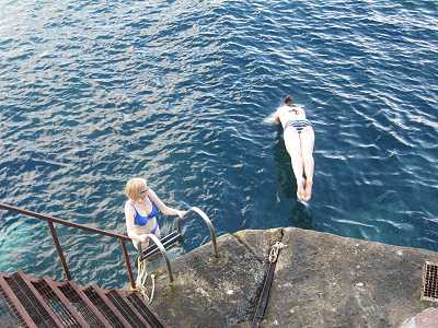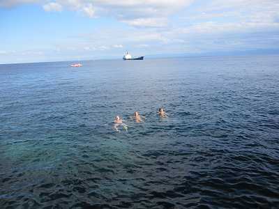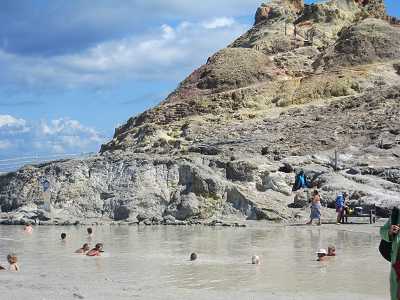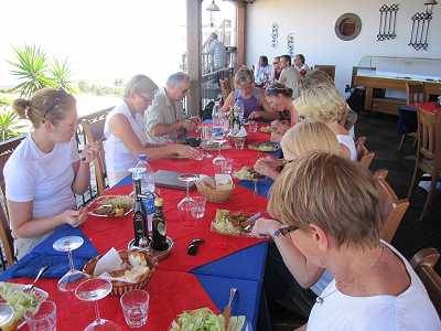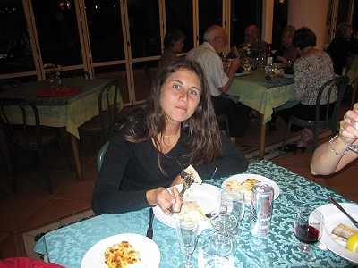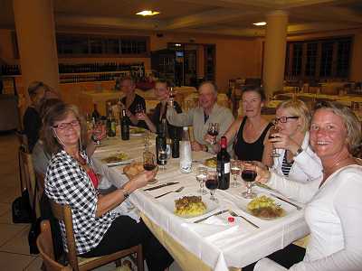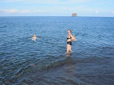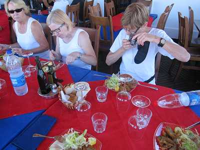 Sedan var det dags att gå tillbaka ner till byn, där det var varmare i luften än uppe på höjderna. Anna bjöd på lunch som blev en sallad och jag drack en öl därtill. Efter lunchen gick de flesta till ett gyttjebad som fanns en bit bort. Jag följde även med men badade inte i gyttjan. Det gjorde däremot en mängd turister. Det verkade som att de flesta som åkte hit till ön Vulcano inte gick upp på vulkanen utan badade i gyttja. Det krävde förstås ingen kraftansträngning att bada i gyttja jämfört med att gå uppåt. För min del gick jag tillbaka till restaurangen och åt en underbart god glass. Strax efter kl. 15 var vår båt tillbaka och hämtade oss för hemfärd till Lipari. Därefter hann vi med några stycken att ta ett dopp både i poolen och i havet. Som vanligt var middagen serverad kl. 20 och räckte till framåt kl. 22. |