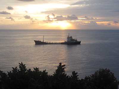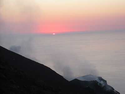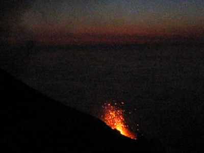 Efter en halvtimme fortsatte vi på led i det svarta mörkret ännu högre upp och kom upp till 930 m.ö.h. Där uppe kunde vi se rakt ner på ett utbrott 200 meter under oss som åtminstone just då brann hela tiden. Bara någon meter framför oss var det brant ner till utbrottet så man måste vara försiktig. Med pannlampans hjälp kunde man se var stupet tog vid. Jag hade tagit upp kameran och bytt till filmning, som gav mycket mer. Efter någon minut fick hålet ett ordentligt utbrott som vida översteg vanligt raketfyrverkeri. Hålet fortsatte att pysa hela tiden och kastade upp mindre lavaströmmar. Efter c:a tio minuter kom ett större utbrott från ett större hål intill och det är detta som hörs regelbundet nere i byn. Så småningom räknade Luka in de drygt 20 fåren och det var dags för nedfärd. Denna var utefter en mycket brant led i lavasand rakt ned. Här måste man ha höga kängor och inga joggingskor, som sjunker ner i sanden. Det blev en rätt behaglig nedstigning i sanden, men naturligtvis tar det på knäna att gå utför c:a 900meter i höjdled. Det tog ungefär 1,5 timmar i mörkret innan vi var nere i byn igen. Vi samlades i samma restaurang igen efter att ha tackat Luka för en professionell guidning. Vi tog en öl eller annat och summerade entusiastiskt den upplevelse vi haft. Alla var mycket nöjda med denna bestigning av Stromboli. Vi hade troligen haft mycket tur som fick se så många vulkanutbrott. I morse var vi uppe före kl. 8 för frukost och sedan packa väskan för att åka båt tillbaka till Sicilien och till ett hotell en bit upp på Etna. Vi fick väskorna skjutsade ner till hamnen där båten skulle avgå vid 12-tiden. Vi gick sedan ner till hamnen och åt en glass och nu sitter vi på båten och har just lämnat ön Vulcano för att åka in till Milazzo. Vädret är strålande, så man måste smörja sig med sololja. Vi har här på båten ätit pizza slice, som Anna hade köpt. Så nu är vi mätta och belåtna. |