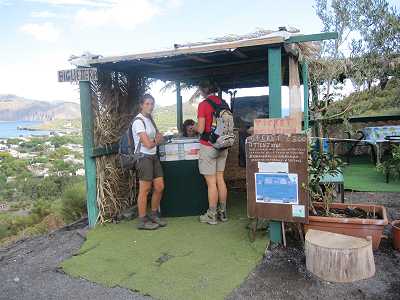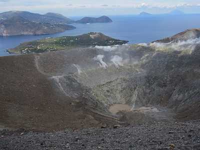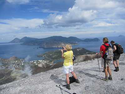 Dag 2: Onsdag 29/9 2010 kl. 22:00 I morse vaknade vi vid 7-tiden och gjorde i ordning ryggsäcken för en dagtur. Jag har tre st. halvliters flaskor med vatten med mig samt en påse med russin och nötter. Dessutom har jag lite kläder och en poncho om det skulle regna. På fötterna har jag rejäla vandringskängor. Man måste även komma ihåg att smörja in sig ordentligt med sololja. Kvart i åtta var det frukost med diverse flingor, ägg, bröd, kaffe m.m. Sedan gick vi ner till lilla hamnen vid Marina Corita, där Anna hade hyrt en båt som tog oss ut till Vulcano. Det är en ö med en något aktiv vulkan, som det pyser ut lite rök. Vädret var varmt och fint runt 25 grader och det skulle troligen bli uppehåll. Vi gick uppför en väg och stannade till vid en liten matbutik för att köpa lite frukt och vatten för dom som inte hade det. Frukt ger bra näring och vätska i värmen och när man ska gå uppför. Sedan skulle vi gå 400 meter uppför i höjdled. Det var en sandig promenadväg rätt brant uppför. Efter en halvtimme kom vi till ett ställe där man tog betalt för att gå vidare. Det var inträde till vulkanen, men det ingick för vår del i resan. |