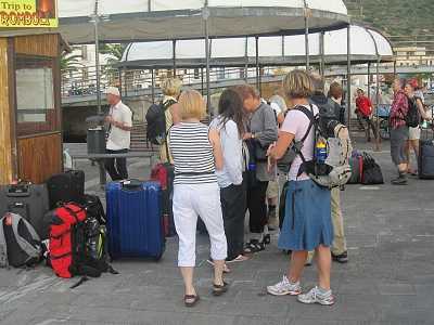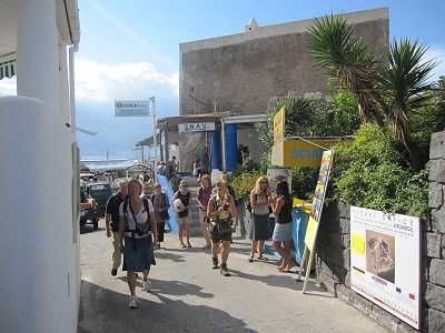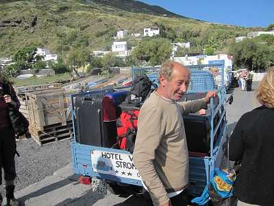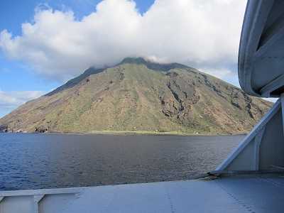 Dag 4: Fredag 1/10 2010 kl. 13:00 Efter kaffet vid Marina Corta i går kväll blev det en promenad tillbaka till hotellet och sedan en sista middag där. Vi avslutade middagen med tärningspoker och sedan satt vi en stund på terrassen och pratade. I morse skulle väskorna packas och efter frukost samlades vi i receptionen för avfärd. En bil tog väskorna medan vi själva promenerade till hamnen. Här kom så småningom en bärplansbåt. Den skulle ta oss till Stromboli, som är den berömda vulkanen där Ingrid Bergman spelade in en film 1949. |