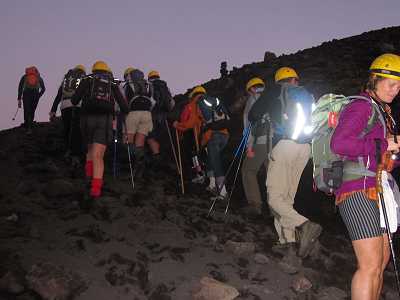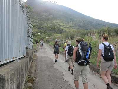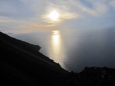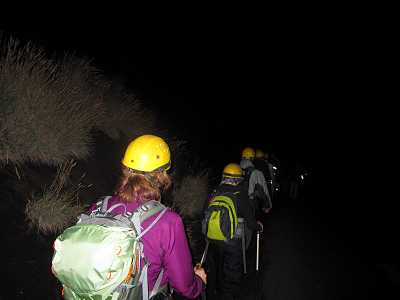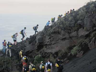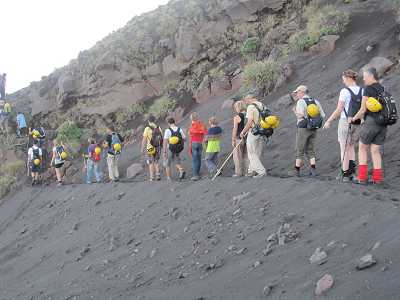 Dag 6: Söndag 3/10 2010 kl. 15:00 Prima Travel hade kontakt med företaget Magma Trekk, som hade licencierade guider för bestigningen av Stromboli. Dom hade sin lokal intill kyrkan, vilket var i närheten av restaurangen där vi ätit lunch. Guiden Luka kom med gula hjälmar till oss, som alla måste bära. Han berättade även om vandringen uppför vulkanen. Totalt skulle vi gå upp till 930 m.ö.h. som är dess topp. Det var många grupper som skulle gå upp på kanske över 100 människor. Man måste ha rejäla kängor. Det var ej tillåtet med joggingskor. Många hade även hjälp av stavar. Även munskydd måste med om sanden blåser upp. Ordentligt med kläder om det blåser upp där uppe samt byte av tröja då man blir genomsvettig. Vi hade även var sin picknick påse med mat för middag och jag bar två termosar med varmt vatten till soppa eller choklad. Jag hade även 3 halvliters flaskor med vatten. Kl. 16.15 traskade vår grupp i väg som bestod av vi från Prima Travel samt runt 10 st. tyskar. Luka ledde oss mycket försiktigt i lugn takt, så att det gick bra även för dom med lite sämre kondition. Man bör dock vara van vid att gå och utan problem kunna vandra en mil. Dessutom tar det på knäna så man ska inte ha några krämpor. Två av våra deltagare stannade hemma, då det var tveksamt med knäna vilket troligen var ett klokt beslut. Vi vandrade sakta i serpentinsvängar brant uppför. Vid ungefär varje 200 meter i höjdled tog vi paus för att pusta ut och dricka. Halvvägs upp bytte jag även t-shirt. Precis när solen var på väg ner i havet kom vi upp till 850 m.ö.h. där vi tog en halvtimmes paus för mat och ta på kläder samt för att titta på utbrotten. Jag passade på att ta på förlängning på mina byxor och en extra tröja innan det blev helt mörkt. Det var kanske runt 15 grader varmt och vindstilla, så det kändes inte särskilt kallt. Kvällen före hade det blåst en hel del så vädret kan naturligtvis växla. Det kunde ju ha varit mulet och regnigt. Nu var det i stället en stjärnklar himmel. |