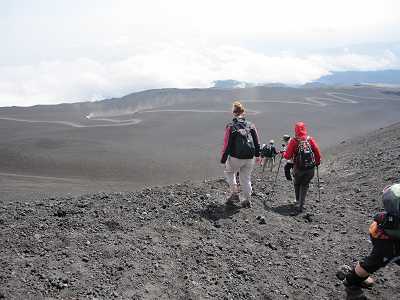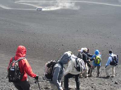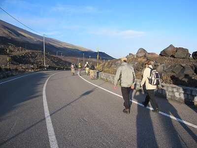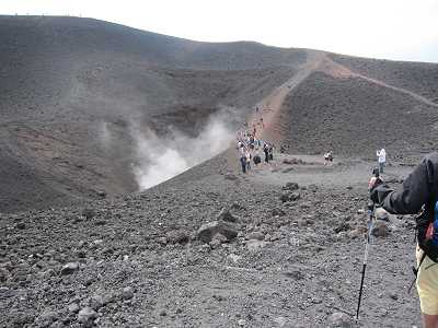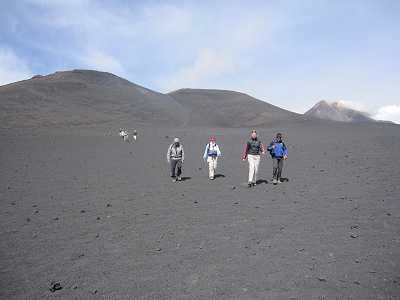Vi åkte först linbanan och åkte med kabinen som tog 6 personer i varje kabin upp till 2400 m.ö.h. Där uppe fanns restaurang samt möjlighet att hyra diverse utrustning. Vi åkte direkt vidare med en minibuss, som tog c:a 30 passagerare. Dessa bussar gick i skytteltrafik på en lavaväg uppför sluttningen till strax under Etnas topp. Allt detta är uppbyggt på nytt efter 2002, då senaste utbrottet var. Där uppe fanns en parkeringsplats, dit bussarna körde folk. Det var säkert flera hundra människor som sedan gick runt där uppe. Vi var välklädda då det blåste och var runt 12 grader fast solen sken. Men det fanns skolklasser där tjejerna t.o.m. gick i högklackat och kjol. I stort sett alla åkte sedan tillbaka ner med dessa bussar Där uppe kunde man se Etnas topp, där det bolmade ut moln med gaser men inga eldsflammor. Vi hade en utmärkt guide Pietro La Rosa, som berättade för oss där uppe om lavautbrotten. Därefter började en fantastisk vandring med honom uppifrån foten av Etna ända ner till vårt boende. Han berättade då och då om hur de olika vulkanutbrotten hade påverkat utseendet av Etna. Det fanns kratrar lite överallt där magman hade sprutat upp. Vi vandrade utför ett månlandskap med lavasand. Ibland var det branta slänter med svart sand som kunde vara jobbiga att ta sig utför. Längre ner blev det så småningom grönska med tuvar av växtlighet. Men för bara åtta år sedan rann det flytande lava där vi gick. Efter några timmar stannade vi för picknick lunch, som vi hade med oss. Vi hade hittat en grön oas bland den svarta sanden och hade en skön lunch. Därefter fortsatte vi utför branten med vår guide som ibland stannade upp för att berätta om Etna. Så småningom var vi nere vid bilvägen, som gick till vårt boende. Vi stannade vid linbanan och fick ett diplom av Pietro och gick sedan till en restaurang för att dricka en öl eller ett glas vin. Nu har vi varit vid vårt hotell en stund och tagit en ducsh och väntar på vår middag. |