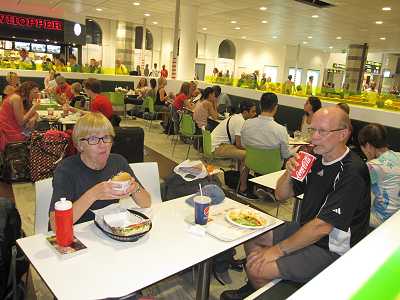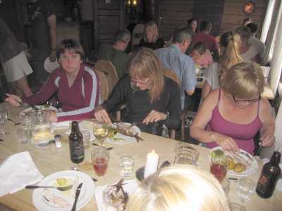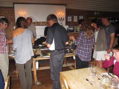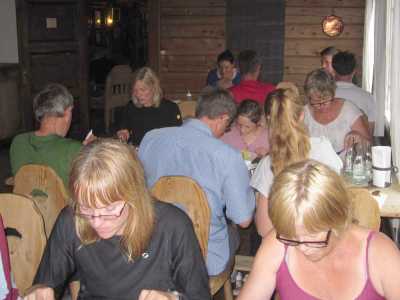 Dag 2: Måndag 29/7 2013 Kl.22:00 Nu har vi gjort oss klara för att sova. I morgon bitti har vi tänkt gå upp kl. 6.30 och komma iväg vid åttatiden. Vädret är på väg att bli bättre. Middagen var väl organiserad så dom ropade upp namn på de som beställt middag och fick tilldelat ett bord. Därefter fick gäster vid var sitt bord hämta mat i turordning. |