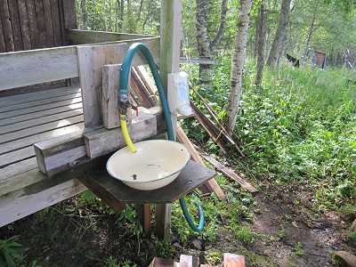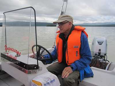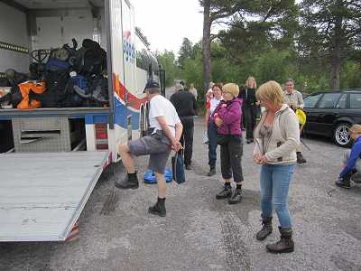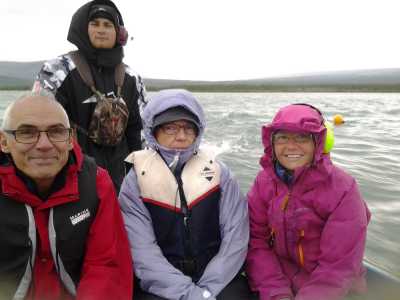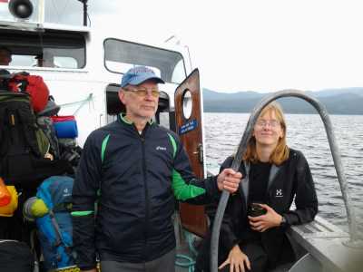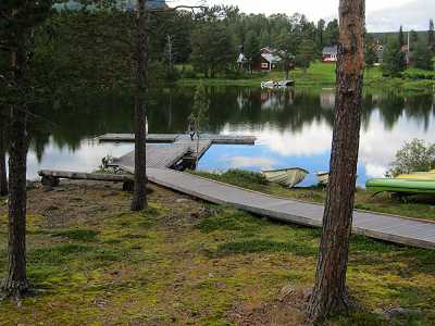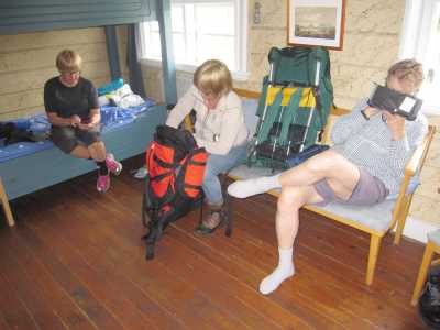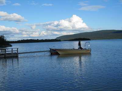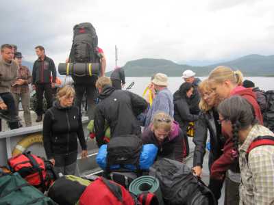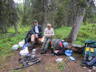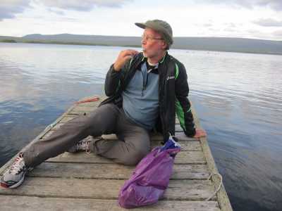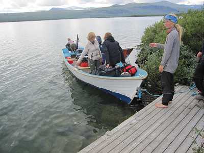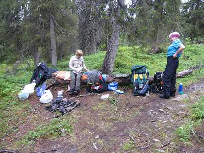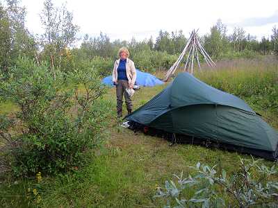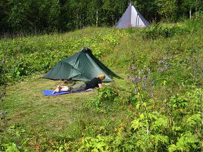Vi andra jag, Anne, Britt-Inger och Bertil tog en lunchpromenad ner till bryggan vid sjön och kollade in hur det såg ut där. Då kom fyra personer ner till sjön och skulle ro över. Det visade sig vara bara en båt där så de måste sedan ro tillbaka med en extra båt. Jag skulle tro att en roddtur tar minst en timme så att ro fram och tillbaka tar säkert 3-4 timmar men det är ju som tur är fint väder. Alla andra vandrare verkar ha gått vidare utom vi. Anne ligger och sover en eftermiddagssömn vid sitt tält och Britt-Inger och Bertil roar sig med att tälja vandringsstavar. |