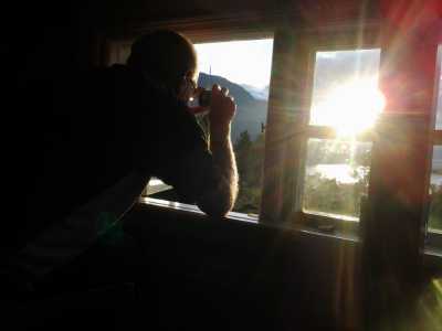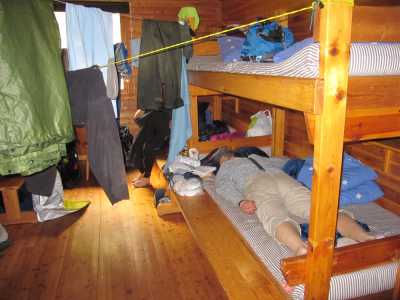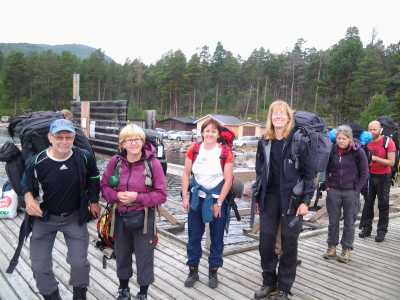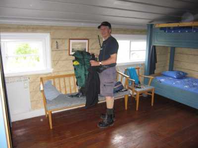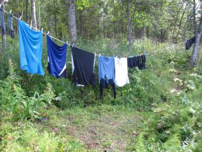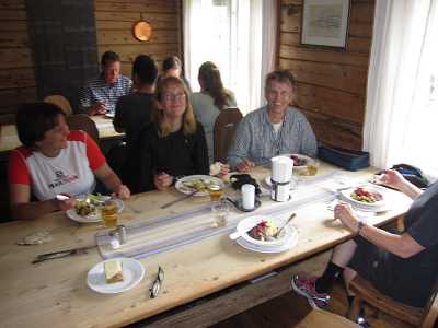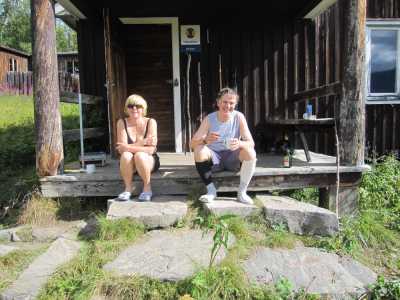 Dag 6: Fredag 2/8 2013 Kl.14:00 Idag har vi vilodag och sitter på verandan och smakar på en Jägermeister. Det är 24 grader i skuggan så den här värmen vill vi inte ha i morgon då vi ska vandra över 2 mil. I morse vaknade jag redan vid sjutiden men tog det lugnt framåt klockan åtta då de andra vaknade. Denna morgon blev det bara te och mackor till frukost. Därefter tvättade en del av oss smutsiga kläder och hängde upp på en lina som stugvärden hade satt upp. |