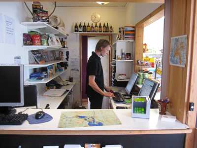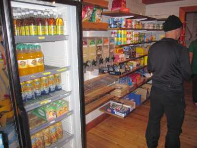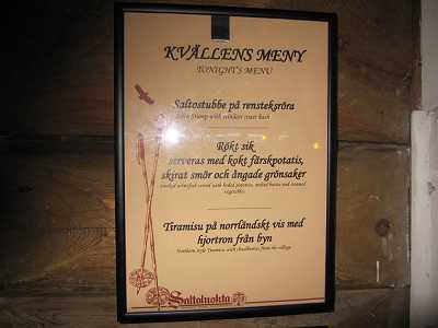Till förrätt var det rökt renkött med sallad och bröd. Därefter åt vi rökt sik och potatis och till efterrätt var det Tiramisu med Hjortron samt en lokal öl till maten. Middagen kostade 325:-. Vi blev ordentligt mätta så det kändes i magen men kan behövas framöver under en veckas vandring. Jag var även in i butiken och köpte tandkräm, torkat renkött och en chokladkaka. Där finns en hel del mat och annat att köpa. |