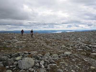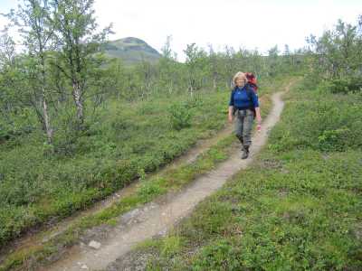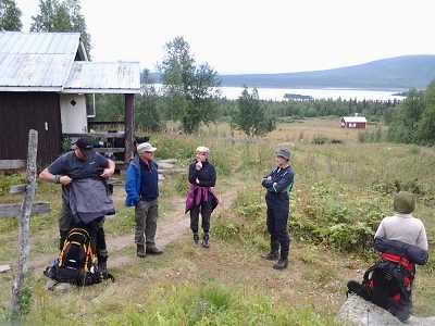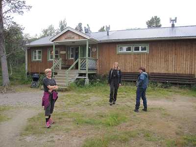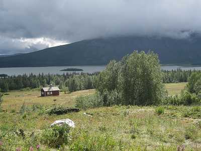 Ibland var det svårt att veta var leden gick. Det var dålig eller snarare ingen markering alls av leden så det var svårt att se att det kunde vara en Kungsled. Här borde länsstyrelsen, som är ansvarig, ta sitt ansvar och ordentligt förbättra markeringen. Uppe på höjden blåste det hårt och regnade men så småningom gick leden neråt på en stenig stig genom björkskogen. Efter fyra timmars vandring var vi framme här i Aktse och bokade sängplats för att torka kläder och få sova i en säng. Nu har vi vilat några timmar och fikat och tar det lugnt. Om det är bra väder i morgon skall vi gå upp på Skierfe. |