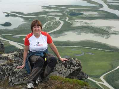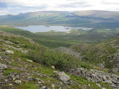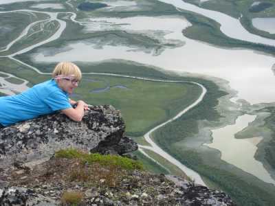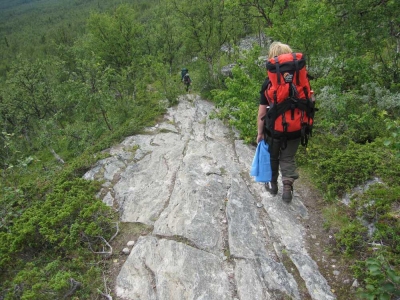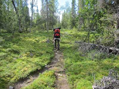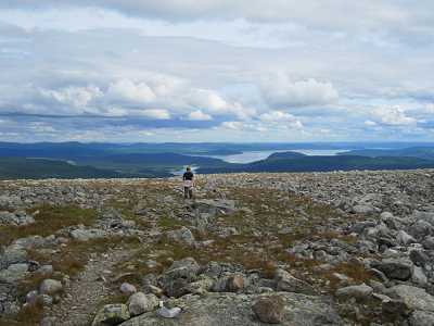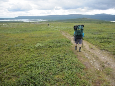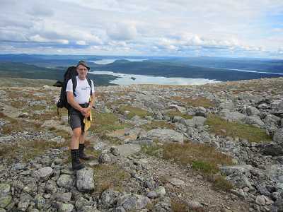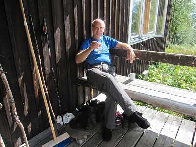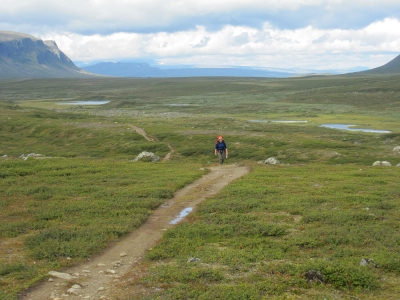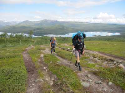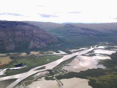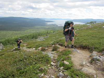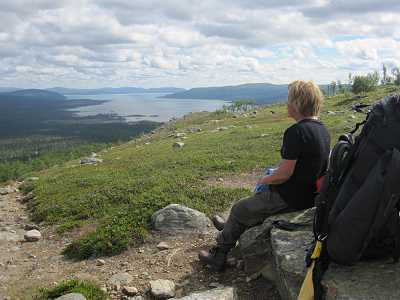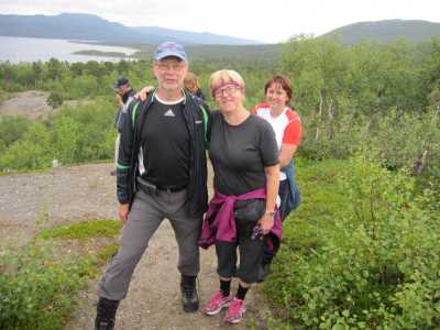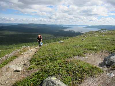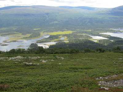 Dag 7: Lördag 3/8 2013 Kl.20:00 Idag blev det en riktigt jobbig dag. Vi har tydligen inte vandrat mer än två mil men det kändes som tre. Det var tur att vi hade vilodag igår. Igår tog även jag en sömntur på eftermiddagen och sedan åt Anne och jag middag redan vid fyratiden. Jag åt min andra frystorkade påse med gulasch och potatismos. Påsarna kostar en del men är praktiska då man bara häller hett vatten i påsen och väntar åtta minuter. Efter maten gjorde vi i ordning lite fika och gick åter ner till sjön. Där fick jag tillfälle att ta ett flertal fina kort in emot Rapadalen. På kvällen bjöd Bertil på likör och jag på Jägermeister. Jag somnade redan strax efter klockan nio men vaknade klockan tre och var jättehungrig. Man ska inte äta sista måltiden klockan fyra på eftermiddagen. Jag låg sedan och väntade och strax före klockan sex var jag uppe och kokade havregrynsgröt. Det blev ändå en del sömn. I morse var vi igång tidigt och följde med stugvärden ner till sjön Laitaure ner till sjön då han skulle skjutsa oss över sjön för 200:- per person. Vi var sju stycken som skulle med denna gång. Karin och Annika tog denna tur redan dagen före så dom har redan vandrat en bit på dagens tur för oss. På andra sidan sjön gick vi först genom en mycket fin blandskog med en riktigt bra stig. Vi hade en trevlig tur genom den skogen fram till en liten jokk med en mindre sjö där vi tog paus. Där fanns det möjlighet att tälta för den som vill det. Därefter gick man först genom skogsterräng innan vi gav oss på stigen uppför en brant och lång vandring uppför en bergssluttning på runt två kilometer. Där blev man ordentligt svettig och vi gick långsamt för att orka med. Det var fint väder med solsken som gjort vandringen extra varm. När vi kom upp runt ett krön fick man där uppifrån en fantastisk utsikt över ett sjösystem nere i dalgången. Där hade det varit fint att tälta om det bara funnits vatten. |
