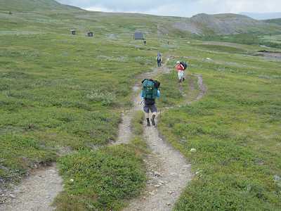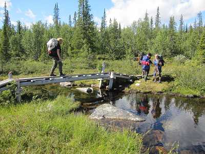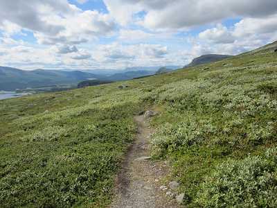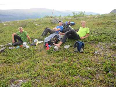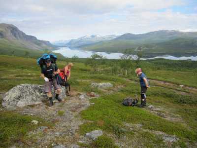 Dag 3: Tisdag 30/7 2013 Kl.20:00 Idag har vi haft en riktigt härlig men jobbig vandring på 20 km till Sitasjaure. I morse var vi igång strax före sju och packade våra ryggsäckar. Det var mycket varmt i rummet i natt fast vi var bara fyra personer. Tyvärr fanns i inget myggfönster så att vi kunde haft fönstret öppet. Det blir ett förslag till STF. Vi åt frukost och gjorde även i ordning ett lunchpaket vilket man själv gjorde i en papperspåse med diverse ätbart. Därefter skulle alla betala om man var skyldig något. Där tog det tid då de samtidigt tog hand om butikskunder. Det blev en del strul med betalningen och det är en bra idé att ta med sig kvitto hemifrån om man har betalat i förväg. Vi kom iväg en kvart före nio. Vädret var växlande och bra för vandring. Först gick vi jobbiga fyra km uppför så alla blev svettiga och vi måste ta flera korta raster. Därefter planade leden ut och vandringen gick rätt fort så kl. 12.15 var vi framme vid raststugan där vi stannade och åt lunch. |