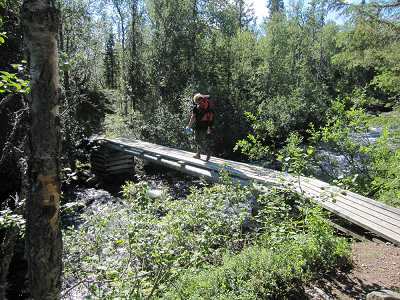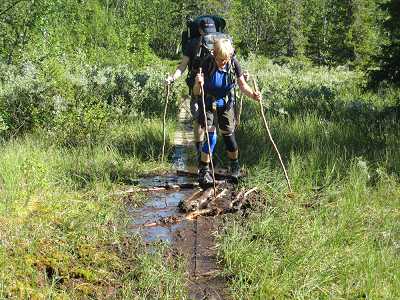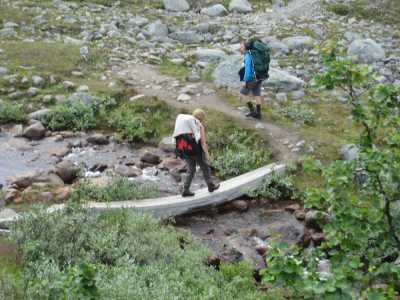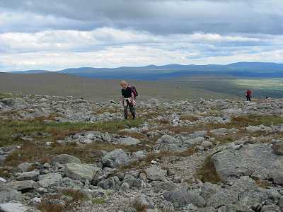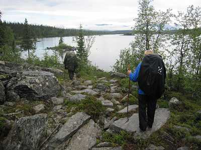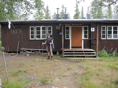 Där dök det upp tre unga killar i tjugoårs ålder från Småland. Det var deras första fjällvandring som var direkt genom Sarek från Suorva som tydligen är en vanlig väg för att börja sin vandring i Sarek. Det påminde mig om min första riktiga fjällvandring 1969 som också var genom Sarek. Vi träffade senare på dessa killar flera gånger på vår vandring söderut. Vandringen fortsatte sedan där uppe på höjden bland annat genom ett stenfält och så småningom såg man hela Pårtedalgången långt där nere. Vi var nu åter på väg ner i skogstrakter. Tyvärr blev det också väldigt stenigt så det blev några mycket jobbiga kilometer. Britt-Inger och Bertil stannade en stund för att fika och senare när de gick vidare var de osäker på om de vandrade rätt. Här kände man åter att skyltningarna är riktigt dålig om det nu finns någon alls. På vissa ställen var det även dåligt med plankor över vattenfyllda stigar. Det var mest gamla halv- eller helruttna bräder Det är tydligen länsstyrelsen i Norrbotten som inte gör sitt jobb. Det ger även ett dåligt intryck mot alla utländska turister som vandrar här. Efter några timmars stenig vandring kom vi äntligen efter drygt nio timmars vandring fram till Pårtestugan. Det kändes ordentligt i kroppen och vi var riktigt trötta efter drygt 20 km vandring men vädret hade varit utmärkt hela dagen. Där tältade Anne och jag medan Britt-Inger och Bertil låg inne i stugan. För oss kostade det 100:- per person och då fick vi använda stugans kök medan de andra betalade 295:- per person för att ligga i en säng i stugan. Den låg intill en sjö där man hämtade dricksvatten och senare på kvällen tog jag även ett kort dopp i sjön lite längre bort men badade inte fast vattnet var inte kallt. Denna natt kom jag att sova alldeles utmärkt men fick ta av mig någon tröja då det blev för varmt. |