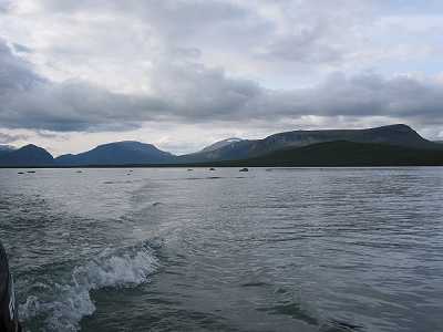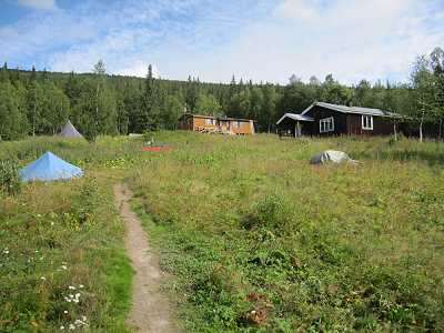 Vi hade tänkt tälta där men beslöt att direkt åka båt över till andra sidan vilket var 4-5 km. Man kunde ro fram och tillbaka med roddbåtar som STF har där men det skulle ha tagit flera timmar beroende på var båtarna ligger. Man måste lämna minst en av de tre båtarna på båda sidor. Vi åkte i stället motorbåt med Lars Blind på tel 0730-799603 och mejladress larsblind87@hotmail.com. Jag rekommenderar att man tar kontakt med honom i förväg. Båtfärden kostade 200:- per person. Vi var framme på andra sidan vid sextiden. Här kunde man tälta gratis medan på Sitasjaure-sidan kostar en STF-plats 100:- per person och natt för medlemmar. Tältplatsen på den här sidan av sjön var ok men det var väldigt mycket med mygg och knott som förtog nöjet. Som tur var fanns det en raststuga där vi kunde laga mat. Redan vid åttatiden låg vi i tältet och försökte sova |