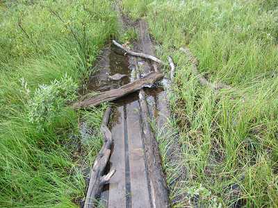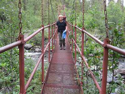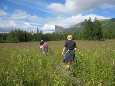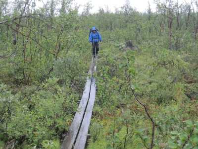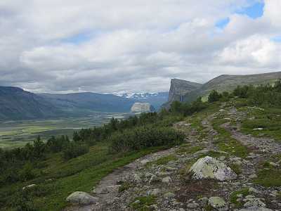 Dag 4: Onsdag 31/7 2013 Kl.17:00 Nu har vi tagit in i stugan här i Aktse då vi var blöta och trötta efter en jobbig klättring över ett pass. I morse kom Britt-Inger och Bertil med båten framåt tiotiden. De hade blivit en del försenade så det drog ut på tiden. När vi skulle lämna sjön och fortsätta vandringen började det att regna igen och sedan hade vi regnet mer eller mindre med oss hela vägen. Vi kom iväg kvart över tio och i början gick vi mycket på träspång i björkskog. I detta läge var det inte svårt att följa leden tack vare att det var bra utlagt med träspång. Senare gick leden mer uppåt och till min förvåning även mot norr. Den blev betydligt brantare och till slut över ett stenskravel vilket var en överraskning. |