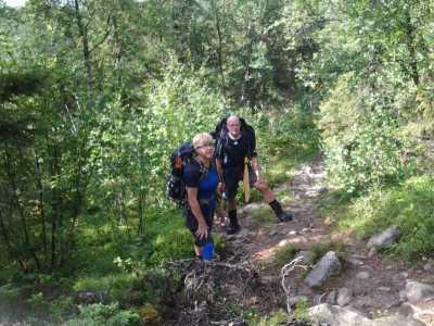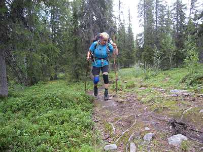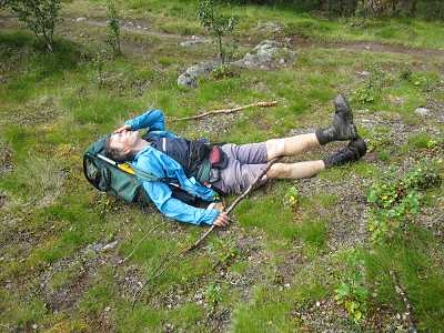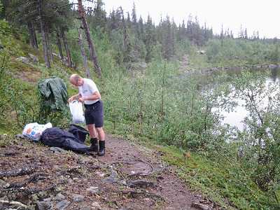 Dag 8: Söndag 4/8 2013 Kl.20:00 I morse vaknade vi till ett varierat väder. Solen sken men när vi packade ihop kom en regnskur. Vi hade ätit frukost och packat ihop strax före klockan nio. Denna morgon åt jag åter havregrynsgröt som jag är glad att jag tog med då det mättar bra. Efter någon timmes vandring på delvis stenig stig möttes vi av regn. Jag hade kommit fram till att mina regnkläder var rätt dåliga. Byxorna släppte genom vatten och ponchon kändes för liten över ryggsäcken. Som tur var hade jag tagit med regnskydd för ryggsäcken så den kändes torr. De nya långskaftade kängorna fungerade perfekt. Jag provade att ha ponchon under ryggsäcken och gick sedan i shorts och T-shirt. Som tur var så var det rätt varmt. Till nästa gång blir det ett riktigt regnställ som gäller. Stigen gick lite upp och ner genom skogen och regnet upphörde vid ettiden så vi kunde äta lunch vid en bäck. Då blev det nudlar i en soppa samt kaffe. Vädret blev sedan allt bättre och även stigen men med fortsatt bristande skyltning. Efter en bro gick en stig till vänster, en rakt fram och en till höger och ingen skylt som visade vilken stig man skulle välja. Det visade sig att stigen till höger var den rätta. |