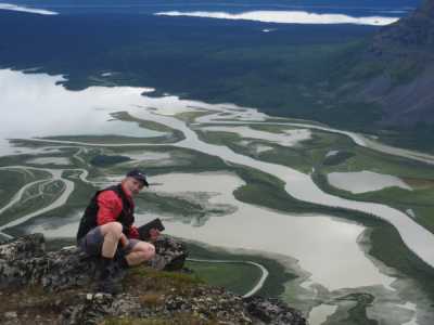 Där uppe var det en fantastisk utsikt ner över Rapadalen och Rapadeltat. Det var en mer fantastisk syn än jag hade tänkt mig. Vi fotade en hel del och jag filmade också. Så småningom drog vi oss neråt igen och denna gång gick det en timme fortare än när vi gick upp. Det kändes en hel del i kroppen så det blir skönt med en vilodag i morgon. Efter en svettig dag provade jag även på duschen som var en slang med duschmunstycke med vatten direkt från fjällbäcken intill. Det kändes som nollgradigt iskallt vatten men skönt att bli ren. Sedan gjorde vi tillsammans en rejäl middag på köttbullar och potatismos och till efterrätt blev det persikoklyftor samt kaffe och kaka. Nu är det sent så det är dags att lägga sig. |