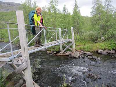 I Pårtestugan hörde vi att tre personer hade gått 12 kilometer extra på grund av att man inte sett när Kungsleden avvek från den större vägen där dom vandrade. Den skylten stod en bit in på Kungsleden och inte vid den större vägen. För vår del kom vi fram till Kvikkjokks fjällstation klockan halvfem. Stationen har varit en mycket positiv upplevelse med utmärkt bemötande från personalen. Här kunde vi välja mellan trerätters middag, a la carte eller något enklare i motsats till i Storulvån där man tyvärr stänger á la carte klockan fem. För min del slog jag till med en utmärkt trerätters middag och vin till maten. Det kändes utmärkt med god mat. Våra kroppar var rätt slitna så det blev en tidig kväll. Vi hade alla bokat sängplats som här kostade bara 205:- per person, vilket är billigare än i Saltoluokta där det kostar 395:- per person. Här har vi åter träffat på Karin och Annika som gått i förväg från Aktse och tältat utefter leden. Vi åt en gemensam middag och pratade om de erfarenheter som vi fått från vandringen. |